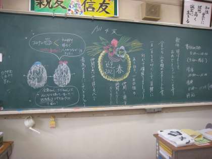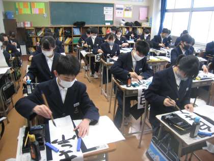 代表者による3学期の抱負を聞いた直後「私たちも何事にもがんばるそ!」という気持ちで、姿勢も立派に書き初めに取り組んでいました。