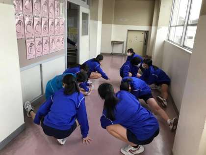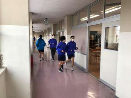 陸上競技部は、校内を走ってからストレッチ。