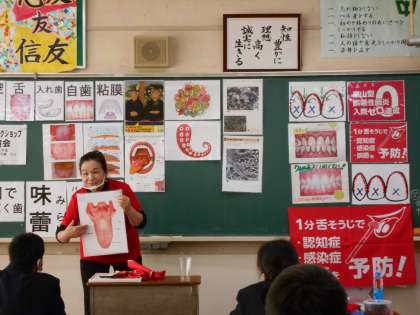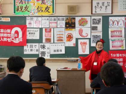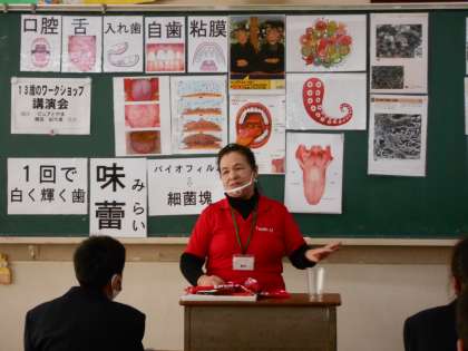 13歳のワークショップ講演会 公開日 2021/01/27 更新日 2021/01/27 1学年 歯科衛生士の精田さんからはいかにして健康で長生きするために私たちができることを 分かりやすく教えていただきました。
