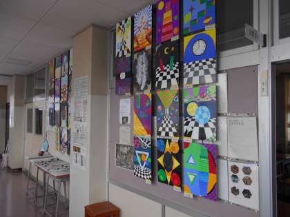 3年生の廊下に、美術の時間に制作した作品が展示されています。