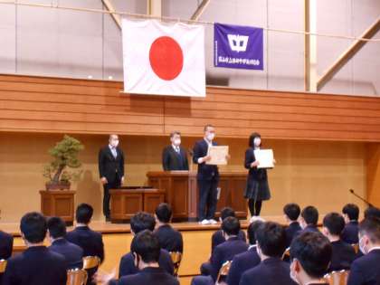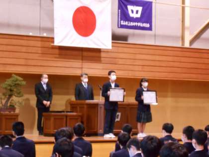本日4時間目に受賞伝達式を行いました。全校生徒が体育館に集まるのは、今年度初めてで、そして最後でした。1、2年生生の前で、3年生が「西中賞」、県中体連表彰、県中文連表彰、皆勤賞の表彰を受けました。