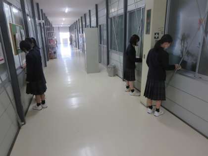 4月20日(火):第1学年 1年生の清掃から(1) 公開日 2021/04/21 更新日 2021/04/21 1学年 職員室前の長い廊下掃除班は、窓枠のレールにちりやほこりがたまっていることに気づきました。今日は全員で、水で濡らした雑巾をかたく絞り、水拭きしました。明日も続きをします。