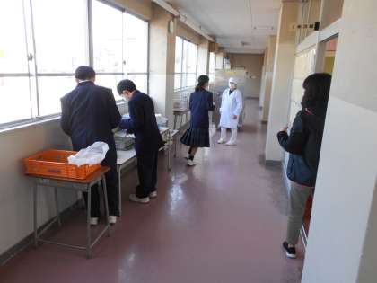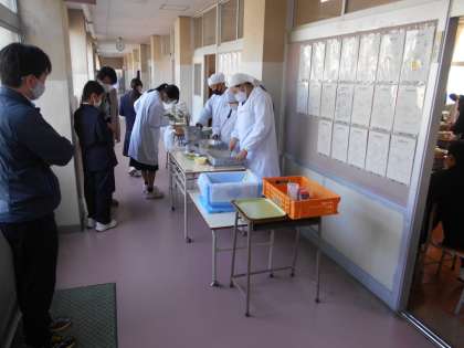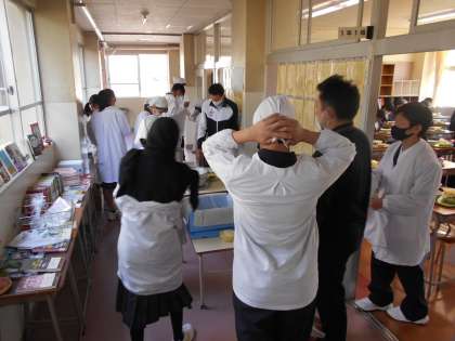 給食が始まって2週間が経ちました。時間のかかっていた配膳の活動もとても早くできるようになりました。給食当番は今日で交代です。白衣、三角巾を自宅で洗濯して、次の当番に引き継ぎます。