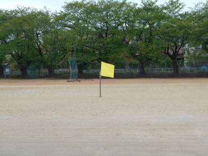 オキシダント注意報の訓練を行いました。今回は生徒の屋内避難等の対応は行いませんでしたが、グラウンドの中央に黄色旗を立てて注意を促す訓練を行いました。