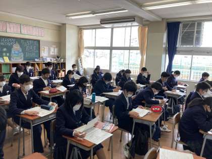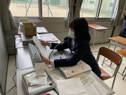 5,6限に生徒総会を行いました。昨年に引き続き、密を避けるために放送を使い、執行部や各委員長が活動計画を説明しました。質問や意見がある場合は、用紙に記入し提出しました。一年生は初めての生徒総会だったので、放送に耳を傾け、資料をしっかり見ていました。