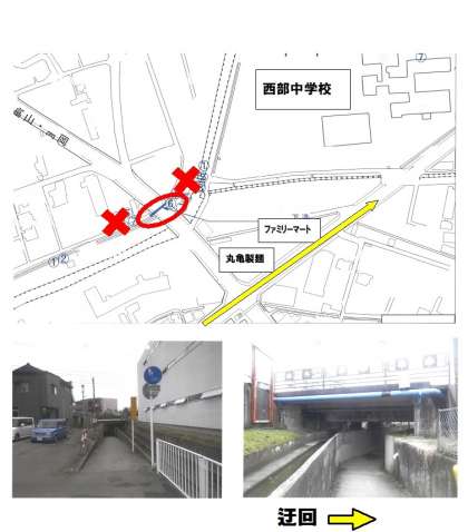 下記の場所が補修工事のため、歩道の減少通行及び自転車通行止めになります。歩行者は安全等に十分に気を付けて通り、自転車通学生は迂回してください。