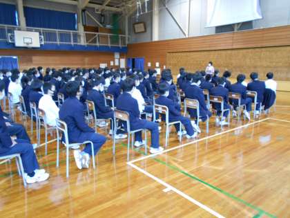 体育館で学年集会を行いました。県内の高等学校や高等専門学校のオープンハイスクール等の申込みについて、また残り少ない期間となった部活動を充実させることについて話をしました。なお、オープンハイスクールの申込み締切は6月2日です。期日を守って提出してください。