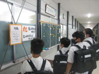 生徒たちが「そうなんだ!」「すごい!!」と優勝の記念盾を見ていました。自分たちの部もこれに続けと、意気込みを新たにしている様子です。