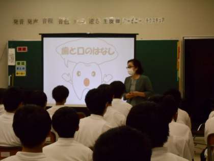 1年生を対象に歯科衛生士による歯みがき指導講演会を行いました。口の機能や歯の構造、病気等だけでなく、コロナ禍での周囲の人に配慮した歯みがきの仕方やマスクの下の表情筋を鍛える方法等についても教えていただきました。ただ歯をみがくのではなく、口の中の細菌を減らすことを意識して歯をみがきましょう。