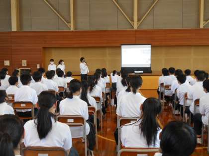 今日の3時間目は、学年集会でした。各学級代表から活動の報告や、夏休みの過ごし方について話がありました。学年担当の教員からは「友達付き合いの中で、相手に調子を合わせ過ぎて、正しいことが出来なくなっていないか?」「良いことも悪いことも、そしてがんばったことも全て、自分のしたことが自分に返ってくる」といった生活や学習について話をしました。