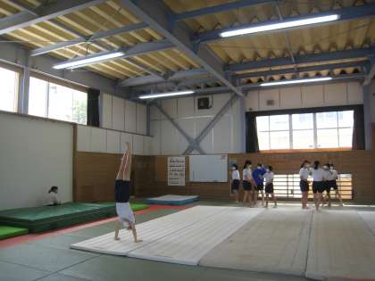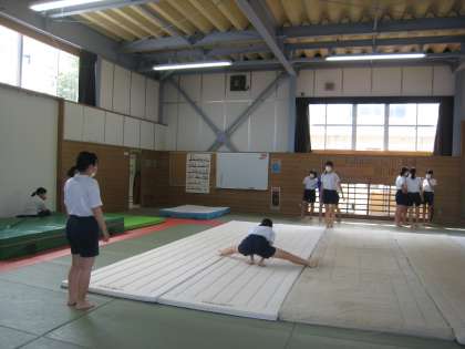 3年保健体育です。マット運動も、1年より2年、2年より3年と、年々美しさが増してきます。うまくできている友達からコツを教わったり、自分なりに練習方法を工夫したりする姿があちこちで見られました。積み重ねることの大切さを感じる一場面でした。