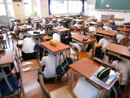 9月1日は防災の日です。本校では朝学活時にシェイクアウト訓練を行いました。地震を想定して、地震の音が放送で流れると、生徒は机の下で真剣に自分の身を守る姿勢をとりました。