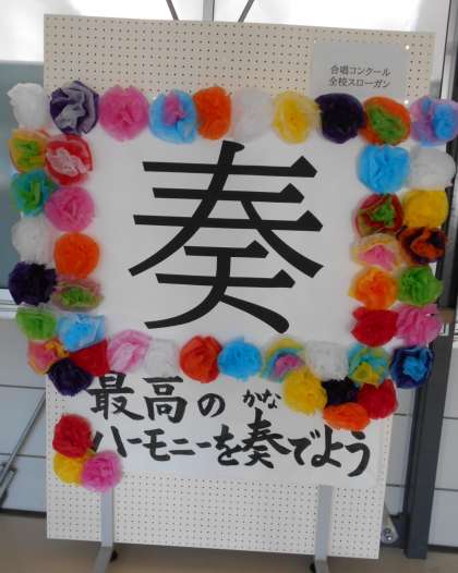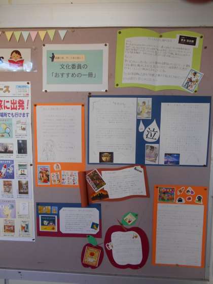 11月8日(月)の合唱コンクールに向けて、スローガンを生徒玄関前に掲示しました。また、読書の秋にちなみ、文化委員会おすすめの本紹介コーナーを図書室前に設けました。