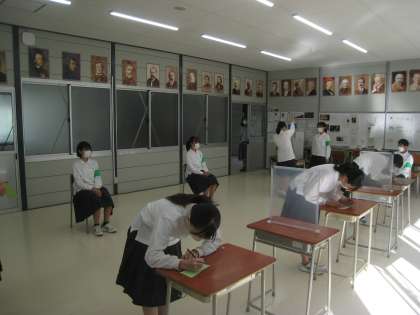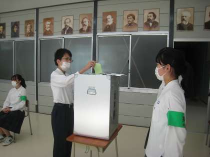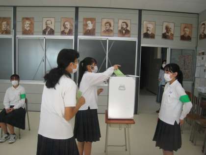 演説後の投票は、投票箱を使うなど初めての形式で行いました。投票する生徒たちも緊張気味です。