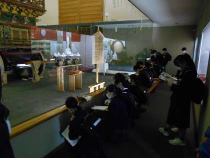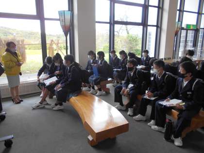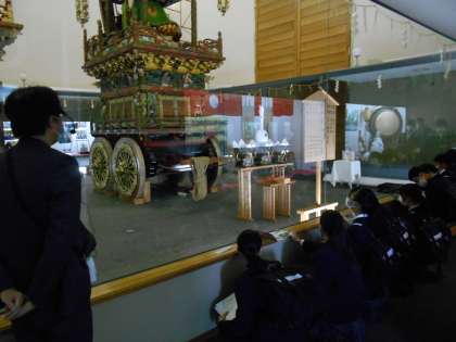 曳山展示館では、曳山の1/7スケールの模型や歴代の曳山祭のポスターデザインなどの展示物を見たり、映像資料を鑑賞したりして「越中八尾曳山祭」の歴史について学びました。