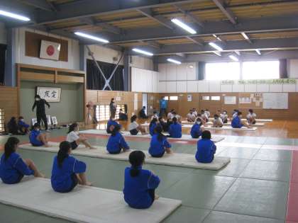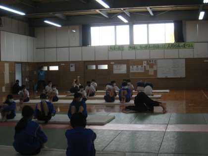富山大学人間発達科学部4年生の学生が教育実習に来ています。保健体育(1年生)の授業でマット運動の指導をしているところです。