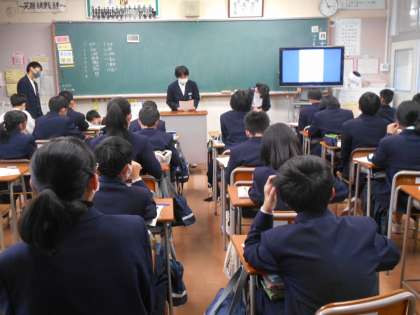 6時間目に八尾校外学習で学んできたことの発表会を行いました。プロジェクターで学習内容をまとめたワークシートを示しながら、課題設定の理由や活動して分かったことについて、順に発表しました。