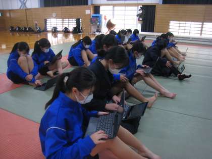 生徒がchromebookで本時の振り返りを入力すると、前画面に映し出されます。それについて、実習生がすぐにレスポンスをすることができます。スピード感をもった授業を展開することができました。