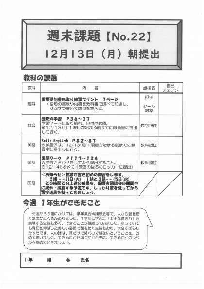 来週の国語の授業では、新年の書き初め大会に向けての練習会があります。各自、習字道具を持ってきましょう。(保護者懇談会の期間中、練習の成果を掲示・披露する予定です)