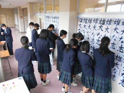 始業式の後、書き初め大会がありました。どの生徒も手本を見ながら、一生懸命に筆を進めていました。