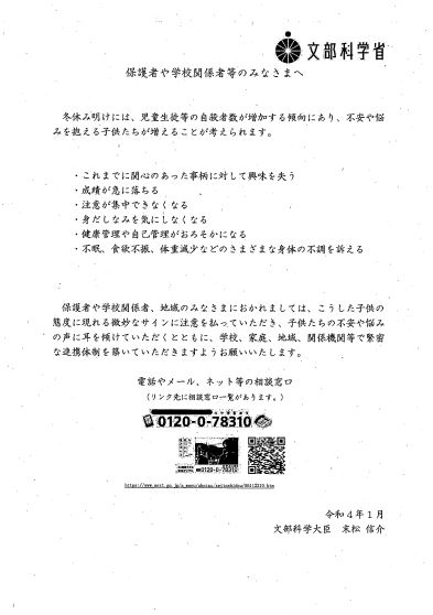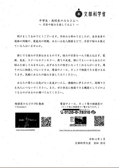 この度、文部科学大臣より全国の児童生徒や学生等へ向けた自殺予防にかかる年始のメッセージが送られました。