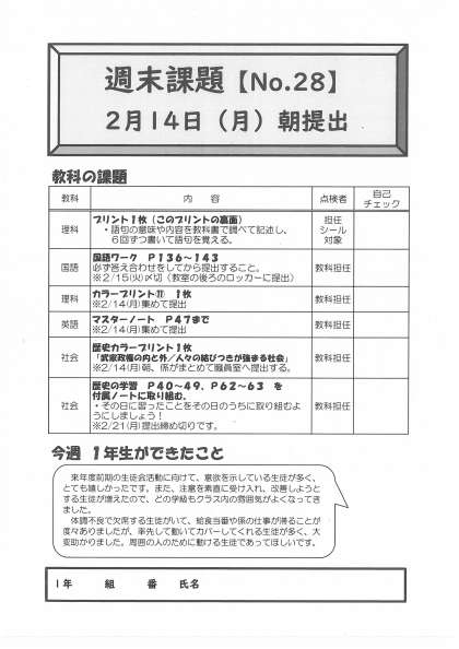 2月10日(木)第1学年 週末課題