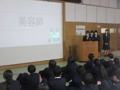 2月14日(月)第1学年 「13歳のワークショップ」振り返り集会 公開日 2022/02/15 更新日 2022/02/15 1学年 5時間目に「13歳のワークショップ」の振り返り集会を行いました。 30名以上の進路学習実行委員が作成したスライドとプレゼンテーションソフトにより、内容の濃い集会となりました。 ワークショップ当日は、6講座のうち2つを選んで受講しました。この日の集会で、他の4講座の内容を知ることができ、新たな学びや気付きがあったようです。