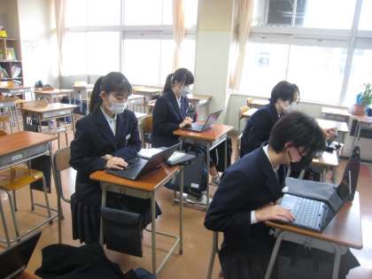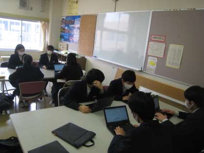 修学旅行実行委員が学年集会の準備をしています。旅行先の見所を調べて発表する予定です。