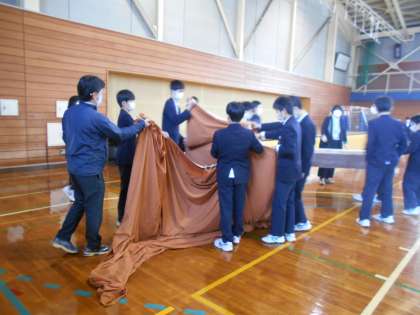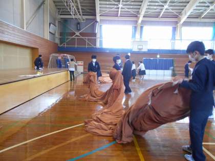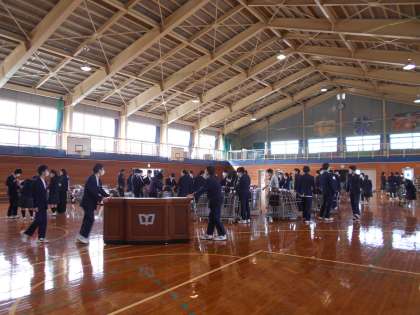 卒業証書授与式が行われた体育館の片付けを2年生が行いました。手際よく、てきぱきと作業に取り組み、あっという間に元通りの体育館になりました。