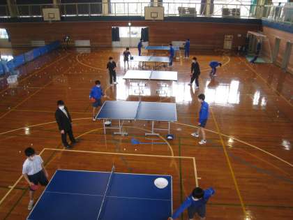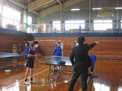 卓球部です。卒業生が、後輩たちに教えに来てくれました。
