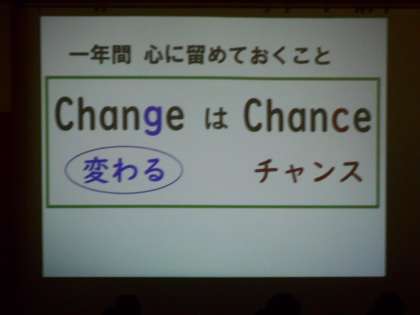 後半は、「少しでも去年より、変化しましょう。変化することはチャンスが生まれます。」という意味を説明し「ChangeはChane」ということを伝えました。この言葉を心にとどめて、去年よりも成長してほしいです。