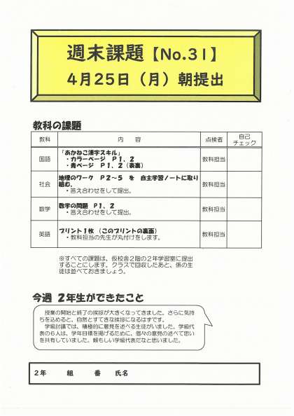 4月22日(金)第2学年 週末課題