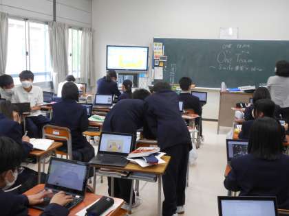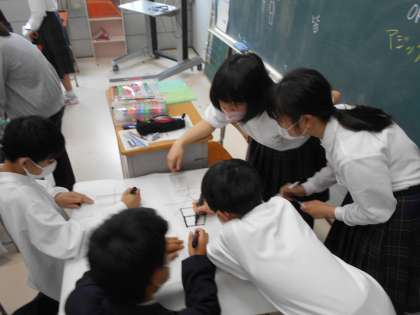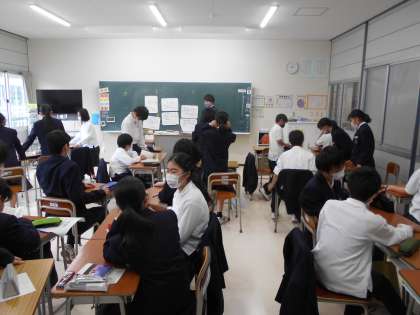 6限の学活は学級目標づくりの時間でした。班毎に意見を出して構想を練っているクラスもあれば、既にガンピに書いて掲示の準備をしているクラス、クロムブックでデザイン案をを考えているクラスもあり、各クラスのやり方で目標を作っていました。