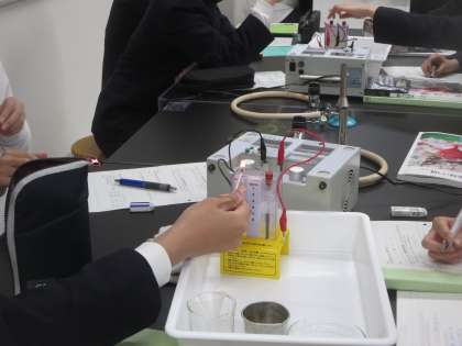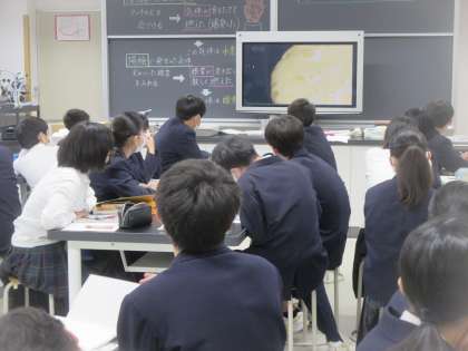 毎回、説明をしっかり聴いている2年生は実験が上手です。準備や片付けも率先して行動しています。また、視聴覚教材を取り入れ、より分かりやすい授業になるような工夫がみられ、生徒の目は画面に釘付けです。