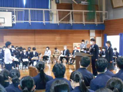 学級討議で出た質問に執行部や委員会から返答が有りました。追加の質問も上がって、活発な総会でした。