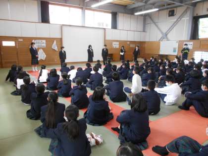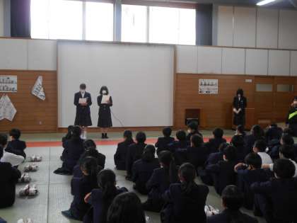 今日の6限は学年集会でした。各学級の学級代表の紹介があり、その後、学年生徒会からのアンケートのお知らせがありました。また、生徒指導担当から「中学生として時間やルールを守って活動できているか、学校生活を省みてほしい」という指導がありました。