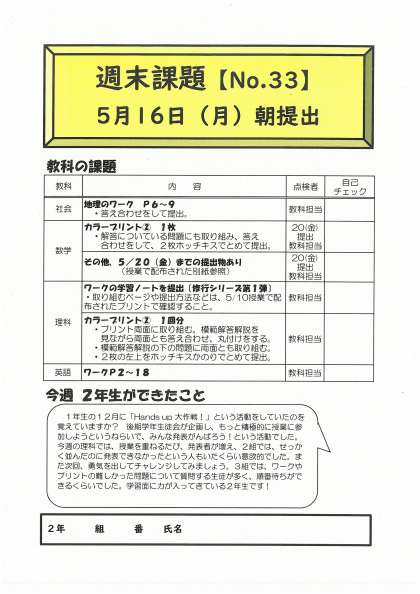 5月13日(金)第2学年 週末課題