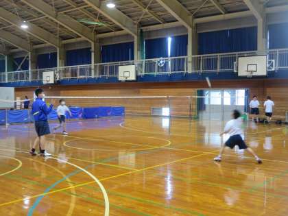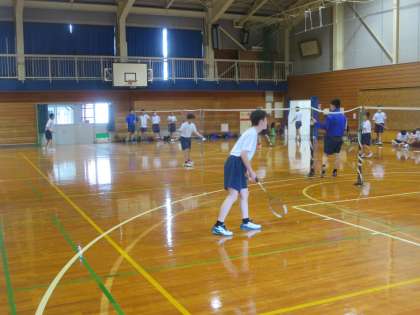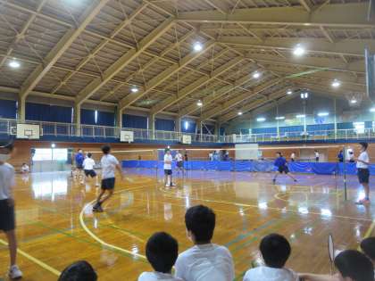 男子バドミントン部は他学年との交流を目的に、先輩が校内戦を企画していました。抽選で誰と打ち合うか分からない1年生は、ドキドキしていたようです。