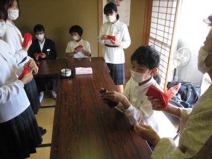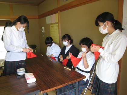 茶道部です。お点前の基本、袱紗さばきの練習をしました。3年生は1年生に教えるために、自分たちのうろ覚えの点をしっかり復習しました。