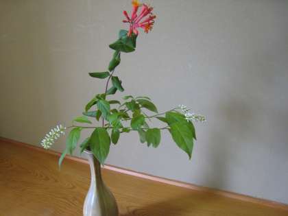 今日の花はニンドウ(別名:スイカズラ)と、山茶がらです。可憐な花で、心が和みます。