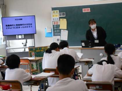 教育実習生が社会の授業を行い、生徒は飛鳥時代と奈良時代の文化の広がりについて学習しました。建物や仏像等の写真を比較し、4人班に分かれて話し合い、飛鳥文化と天平文化の違いを見つけました。