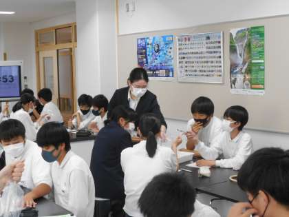 教育実習生が理科の授業を行いました。生徒は化学変化によって温度がどのように変化するか実験を行いました。カイロや冷却パックに利用されている仕組みを理解することができました。