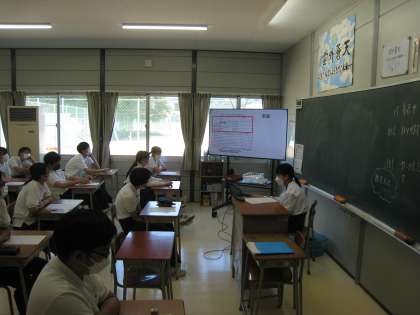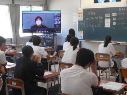 期末テストが終わった直後、体育大会に向けての学年集会を行いました。体育館で行う予定でしたが、猛暑のため急遽リモートでクラスに分かれたままで行いました。