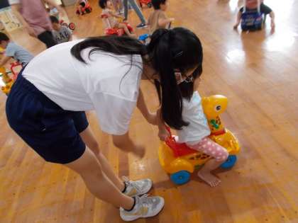 保育園の先生方の配慮で、0〜5歳児の幅広い年齢の子どもたちと接することができるように予定を組んでもらっていました。1歳児にはおやつの介助をしたり、2歳児には乗用玩具の補助をしたりと、年齢に応じた生活補助をしていました。
