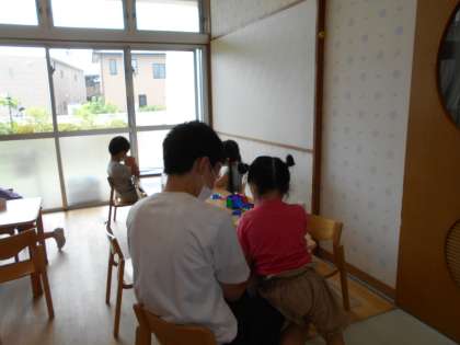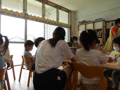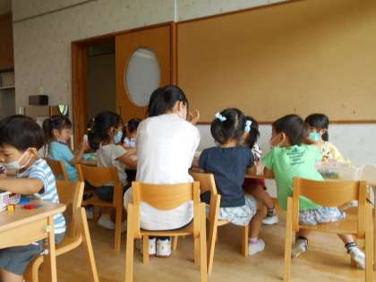 まだ初日で始まったばかりのため、少し緊張感もある中、クラス別に子供たちと遊んでいました。かたかご保育園出身の生徒も多く、先生たちも温かく見守っている様子でした。
