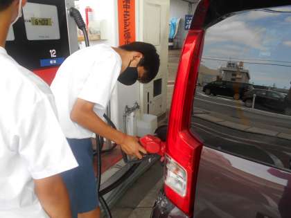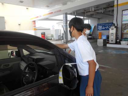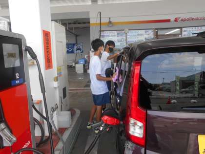 窓ふき、ガソリンの給油をしていました。窓を隅々まで吹き、ワイパーの上げ下ろしもそっと行い、丁寧な仕事ぶりでした