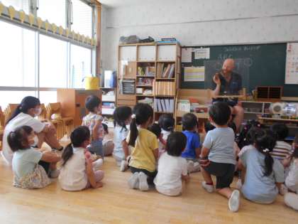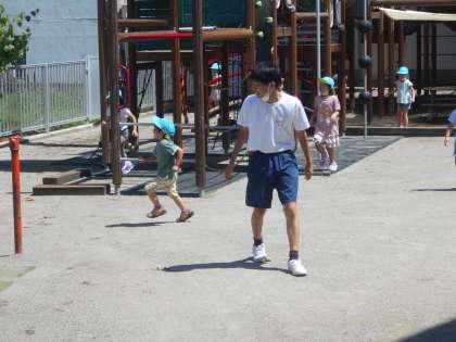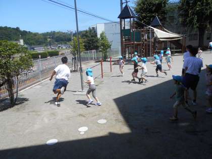 しっぽとりゲームでは、学生のおしりにしっぽをつけて、学生が逃げ子どもたちが追いかけていました。学生達の本気と無邪気な笑顔、そして追いかける子供たちの真剣な眼差しが印象的でした。指導ボランティアの方々はお忙しいところ、とても丁寧に対応していただきました。卒園生がほとんどで、学生の成長をみて嬉しそうな温かい表情で見守ってくださっていてありがたかったです。