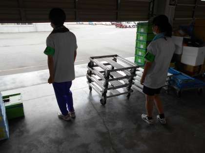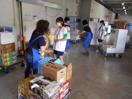 配送前の荷物の梱包作業を行っていました。多くの商品を前にして、事業所の方の指示に従い作業することができていました。生花の鮮度を保つための水をバケツにためていました。
