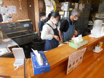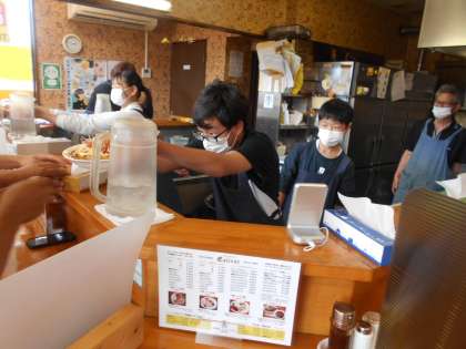 午前中は、玉ねぎの皮むきなどカレーの下ごしらえ、店内の掃除をおこないました。接客時は「いらっしゃいませ」とお客様に声掛けしカレーを提供し、お客様が帰られた後の台を丁寧にふいていました。昨日、遅れてしまった子がいたようなのですが、その分、今日は挽回しようと、早めに来て一生懸命そうじをしてくれたと事業所の方が話してくださいました。失敗しても次に活かそうとか挽回しようとする姿が見ることができて嬉しかったです。