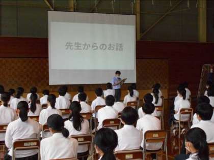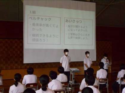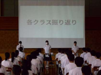 1学期最後の学年集会を行いました。学年生徒会からは1学期の学年生徒会活動の振り返りとクラスの様子を話し、学年担当の先生からは夏休みの過ごし方、「社会に学ぶ『14歳の挑戦』」でお世話になった事業所からのアンケート結果を話しました。
